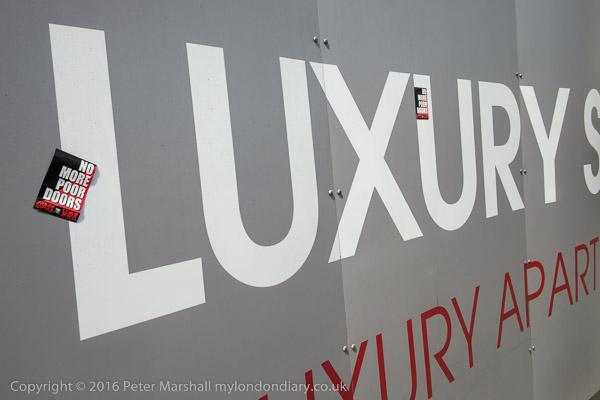 I was walking to visit a friend when I say there were stickers all along the fence where luxury flats are being built next to East Croydon station. There were more stickers on the boards surrounding another new luxury development on the other side of the road. I only took a few pictures.