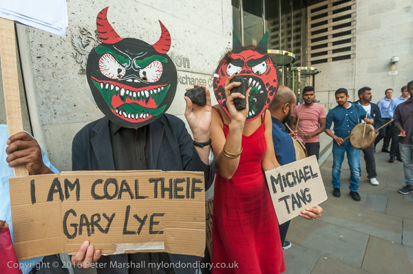 A protest outside the Stock Exchange called for an end to plans for open-cast mining at Phulbari in Bangladesh by British company, Global Coal Resources Management and for the company to be de-listed from the Stock Exchange Alternative Investment Market.