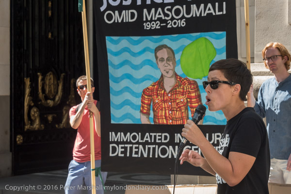 As well as posters, the protesters carried a banner for Omid Masoumali, an Iranian refugee who died in a Brisbane hospital two days after setting himself on fire in front of visiting officials from the United Nations High Commission for Refugees (UNHCR) after learning that he would be held in the island detention camp of Nauru for another ten years.