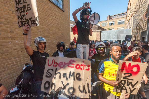 Couriers for UberEats food delivery service and their supporters demonstrated outside the company's offices in Bermondsey after cuts in the rate per delivery by the company mean some drivers fail to earn the minimum wage.