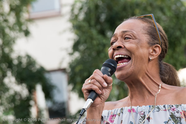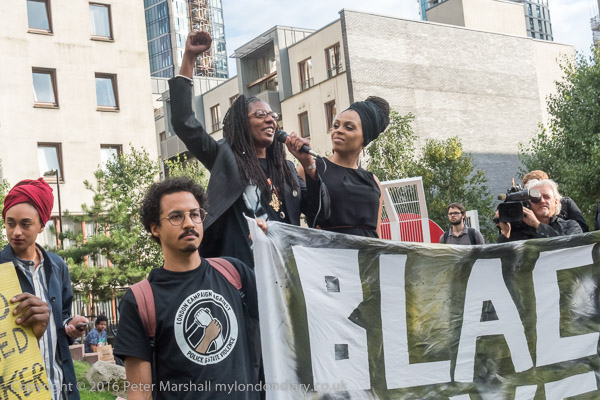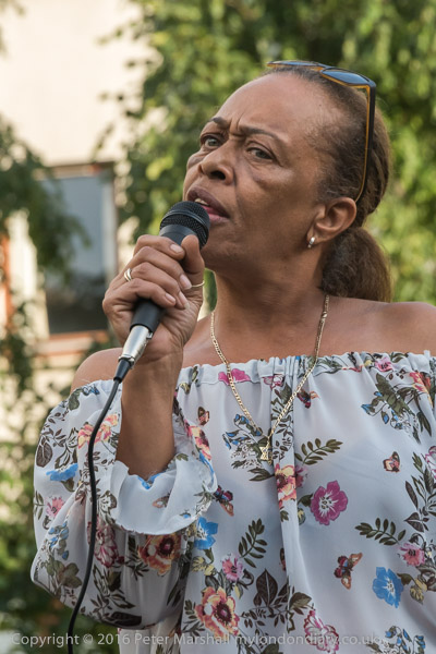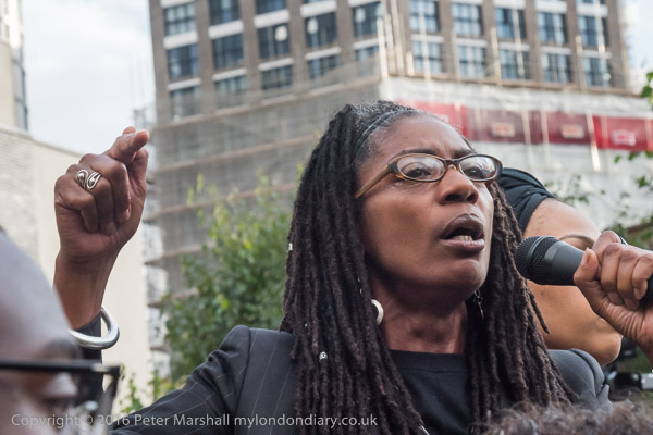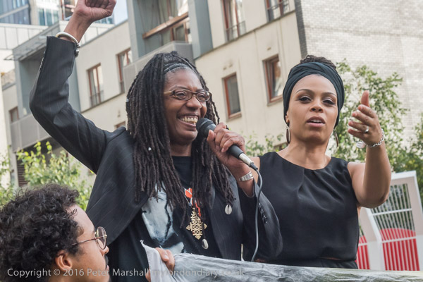 London, UK. 5th August 2016. Marcia Rigg, whose brother Sean Rigg was killed by police in Brixton in 2008, raises her fist in salute