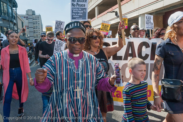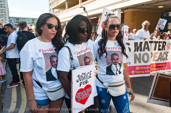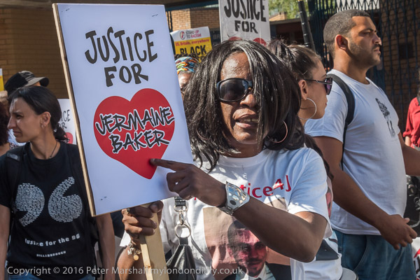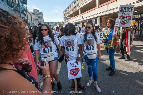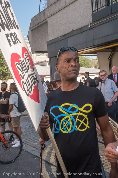 Anti-racist campaigner Stafford Scott holds a placard 'Justice for Smiley Culture'