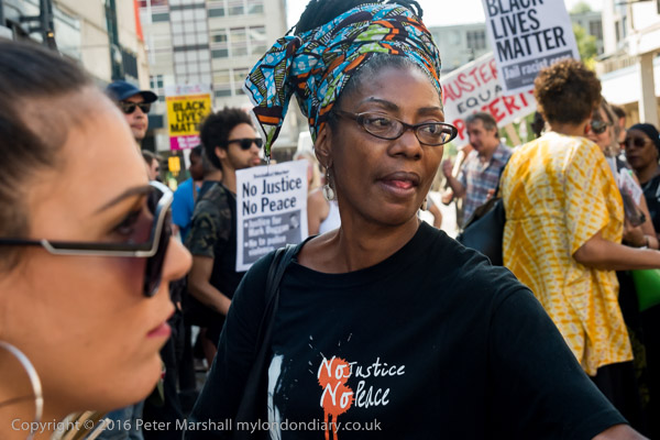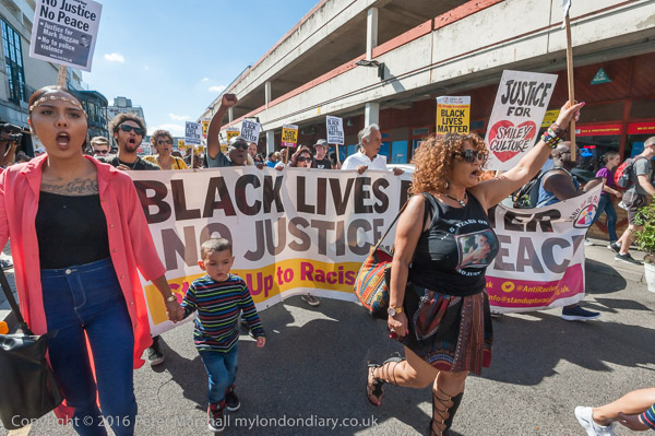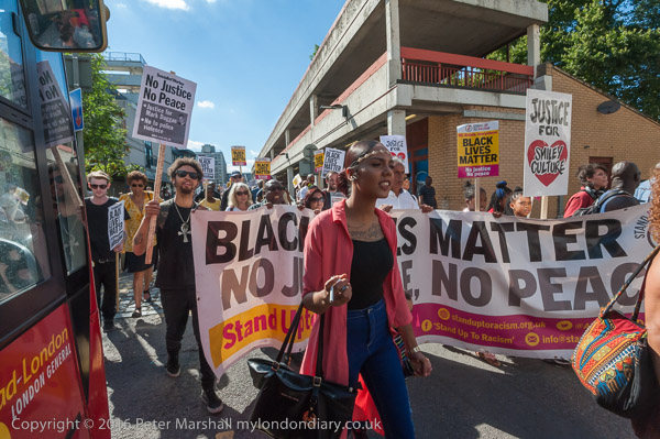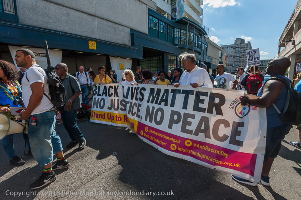 The main banner 'Black Lives Matter - No Justice, No Peace' form Stand Up to Racism