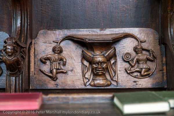 There are many of these interesting carvings in the chancel of St Laurence's Church, some rather more pious