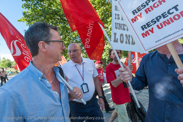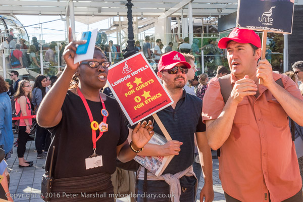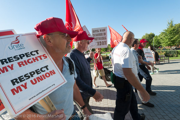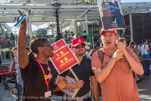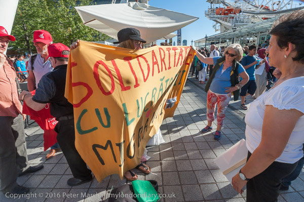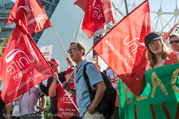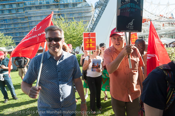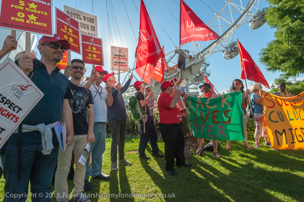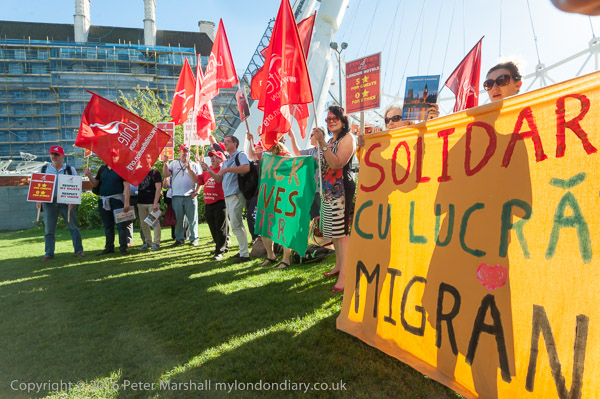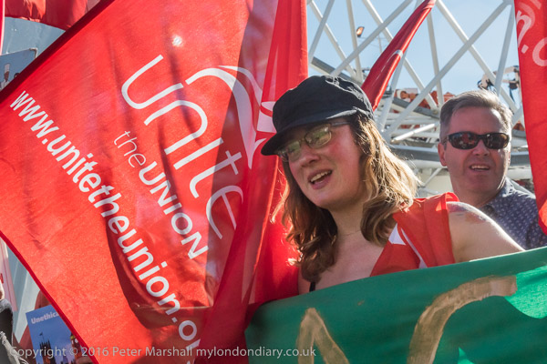 There are banners 'Black Lives Matter' and for solidarity with migrants akibg with the Unite flags
