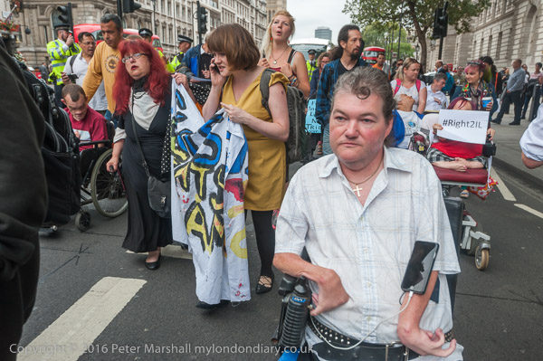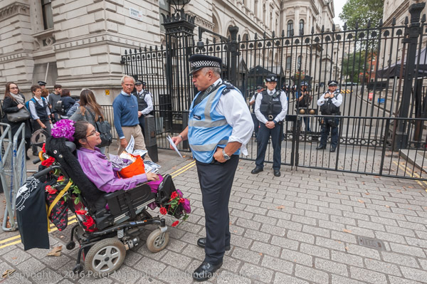 The protesters stop on the road in front of Downing St. Police direct traffic around them