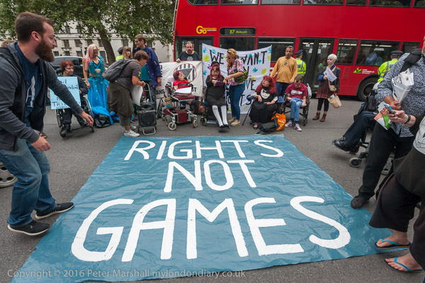 'Claire Glasman holds a poster 'Fund Independent Livinv NOT Traiden!'