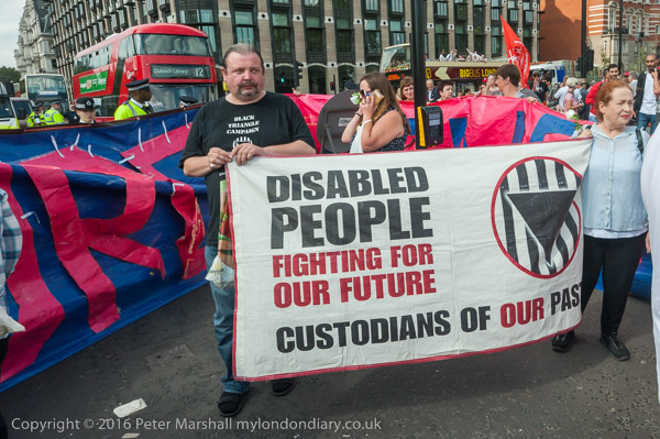 Placards give details of some who have died from benefit cuts. One woman wears an apron with some of their names. Others hold photographs of them