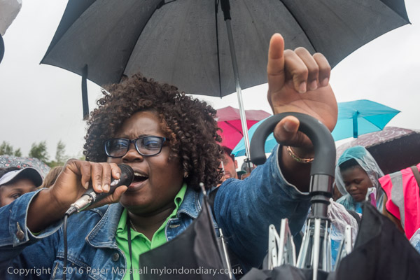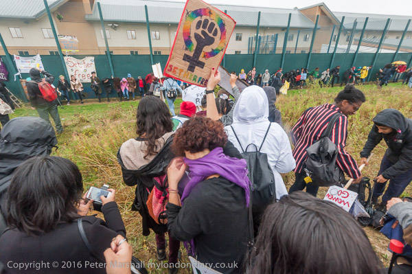 A woman holds a poster condeming two of the private companies that run our immigration prisons 'mitie murders - serco scum'
