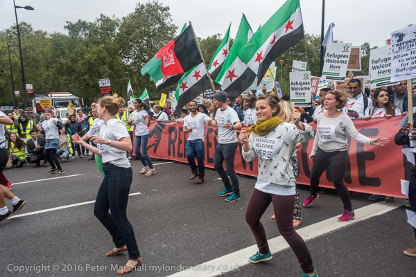 and the dancers come on to perform, wearing 'Refugees Welcome Here' on their chests
