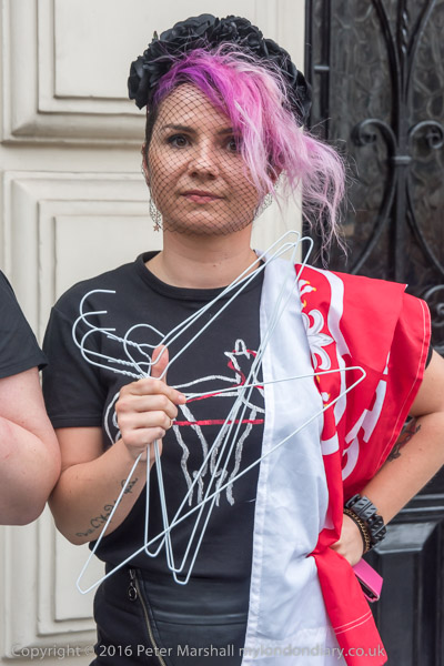 A feminist holds wire coathangers which were often used in illegal abortions - and often caused permanent injury or death
