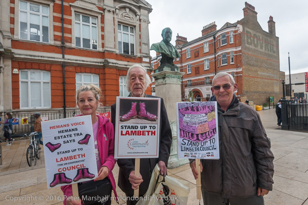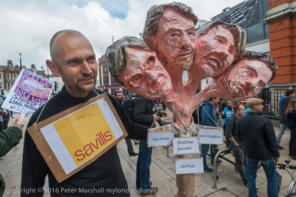 and he holds his 4-headed sculpture of the villians of Lambeth Council: Lambeth Labour leader Lib Peck, Cabinet Member for Housing Cllr Matthew Bennett, Cabinet Member for Regeneration, Business and Culture Jack Hopkins and Sue Foster, Strategic Director, Neighbourhoods and Growth.