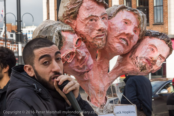 Sid Skill with a poster 'Lambeth Council Demolition Crew - Home Wreckers' naming and showing the four Lambeth villains
