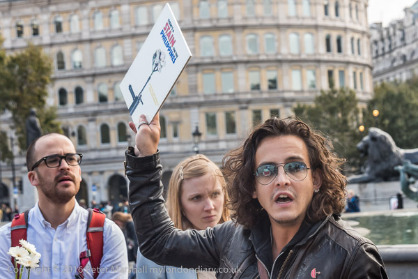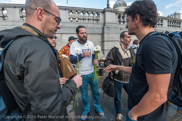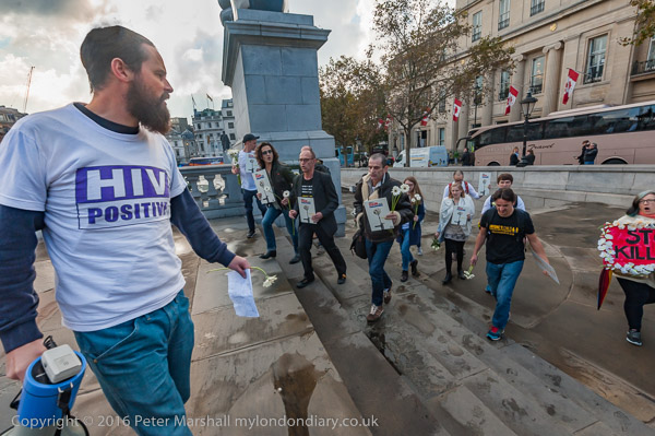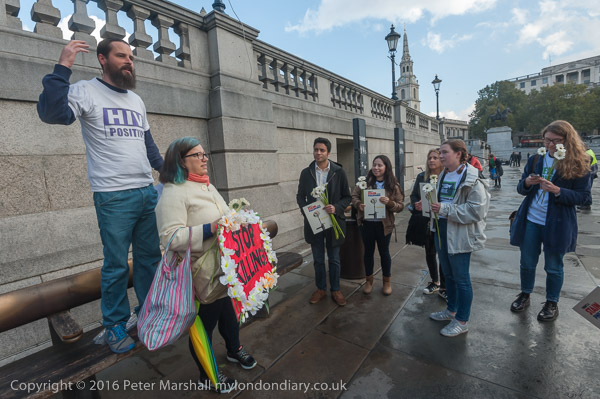 People from ACT UP London meet in the corner of Trafalgar Square
