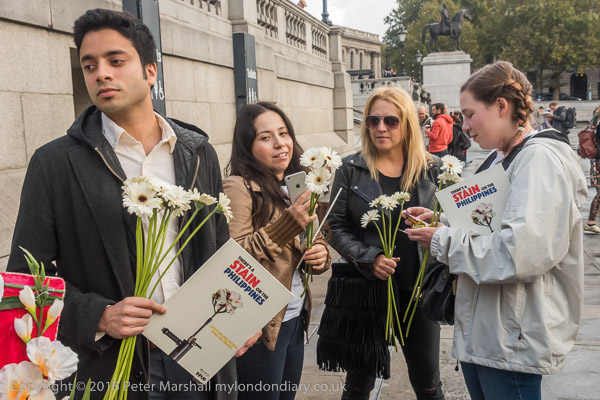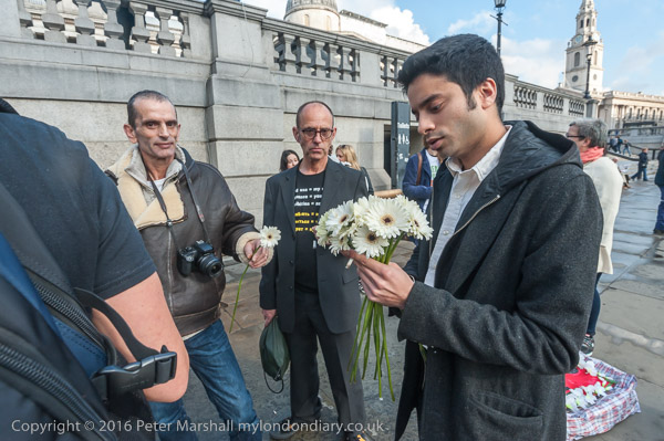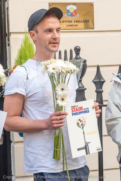 Activists share out white flowers to carry to the embassy