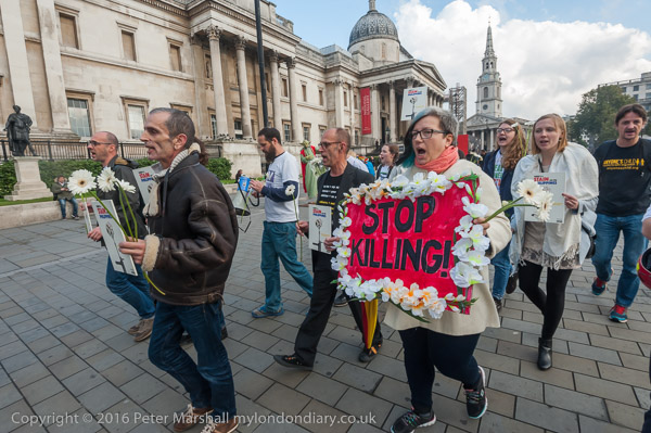carrying white flowers and a poster 'Stop Killing' surrounded by white flowers