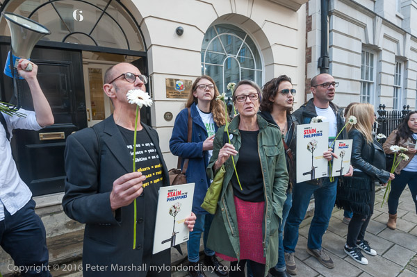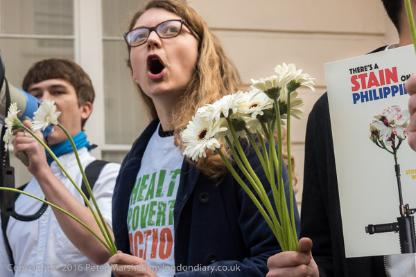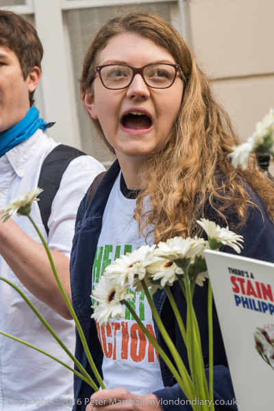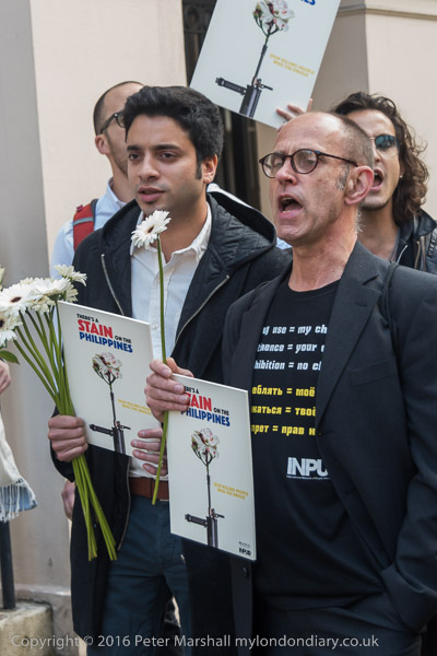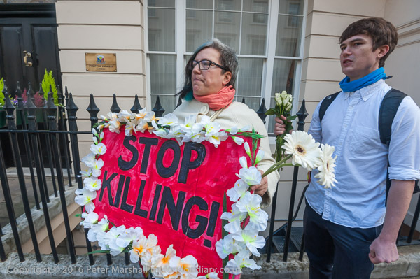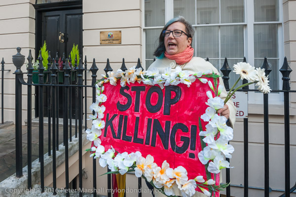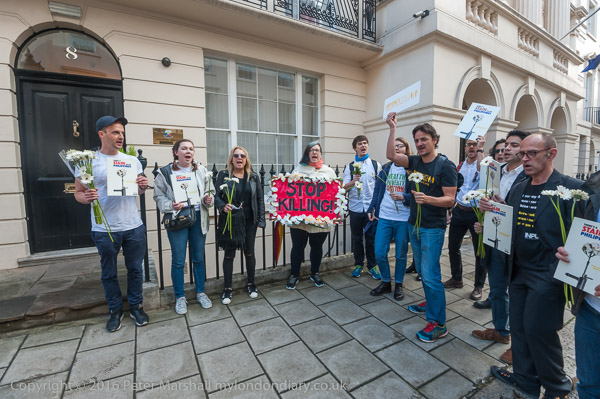 And the protest begins outside the embassy with chanting and some short speeches