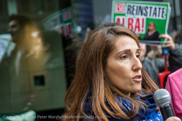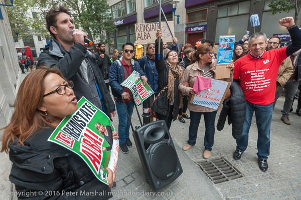 Sid Skill from Class War with a poster 'LSE Reinstate Alba'