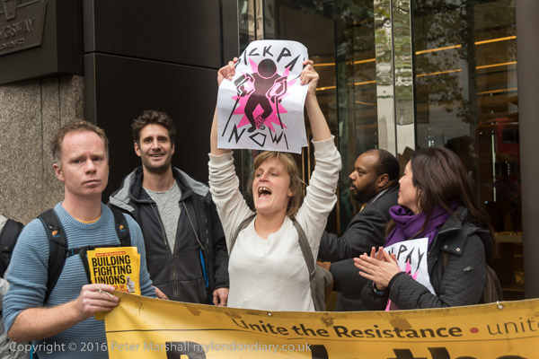 Vera from the UVW holds up a poster 'Sick Pay Now'