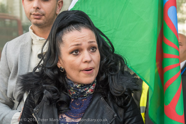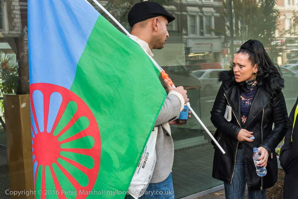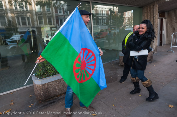 Protesters outside the embassy with a Romany flag and security guard
