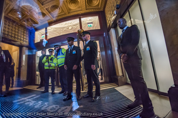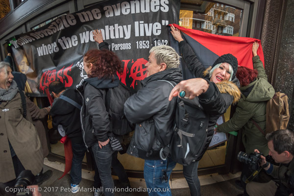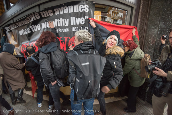 Class War hold up their banner in front of the doors to stop the filming
