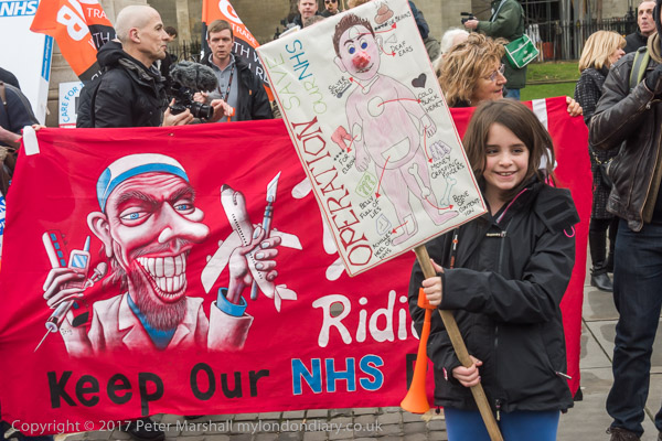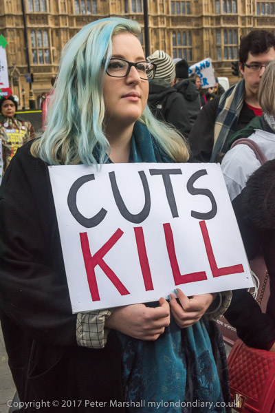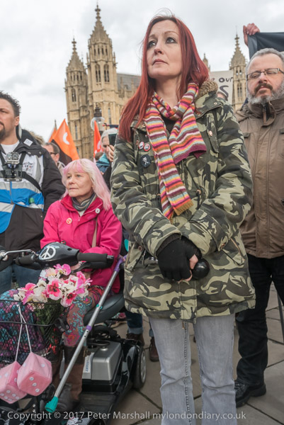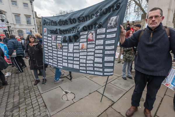 Deaths form sanctions and benefit cuts - a few of the victims listed on the banner