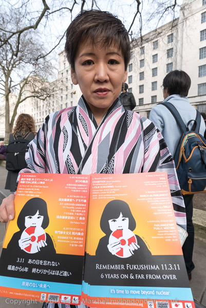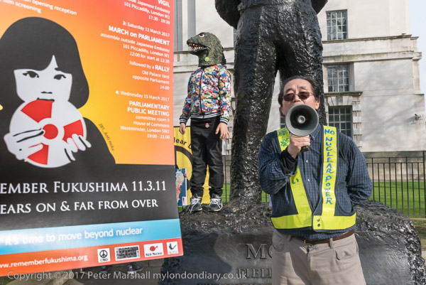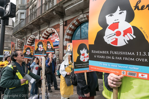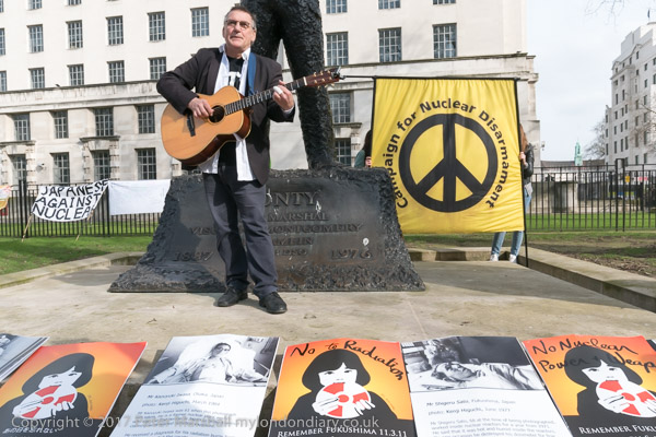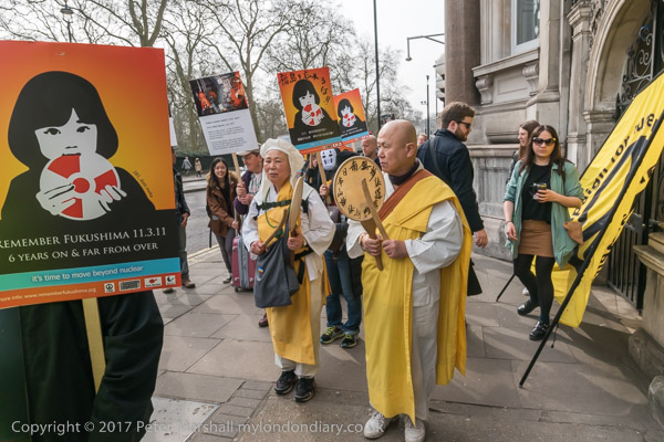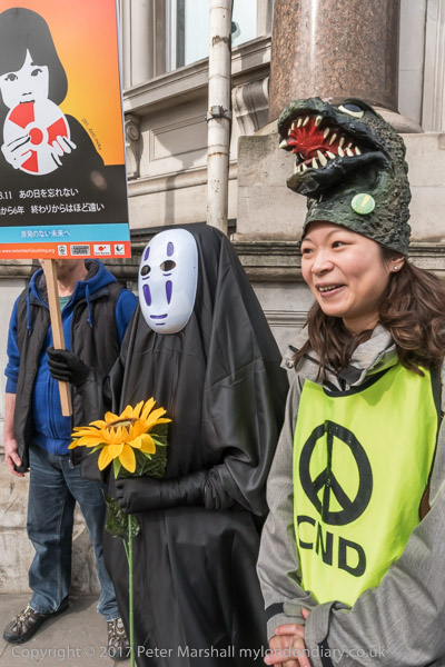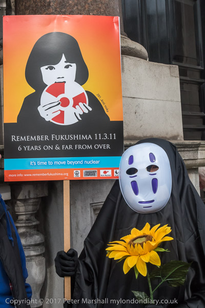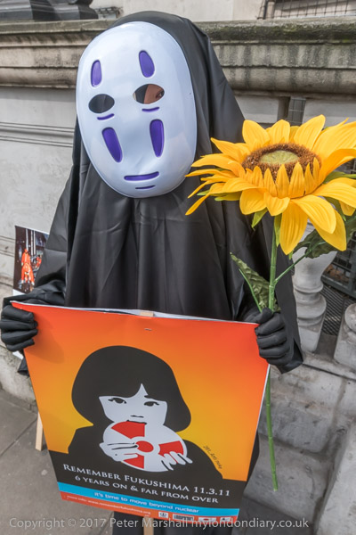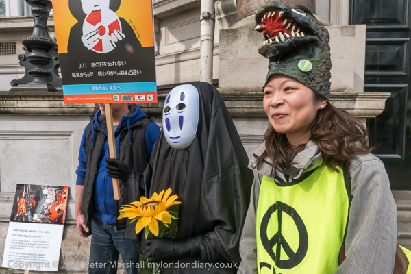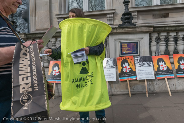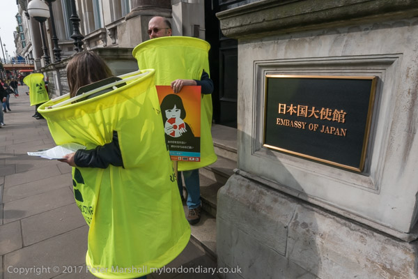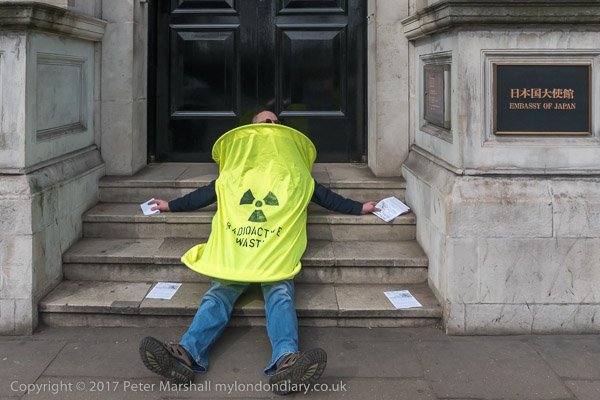 A campaigner dressed as a barrel of radioactive waste on the steps of the Embassy of Japan