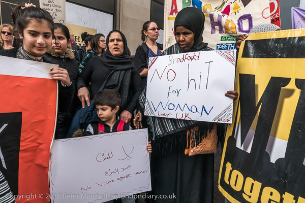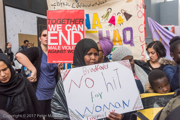 A woman from Bradford holds a poster against women being hit
