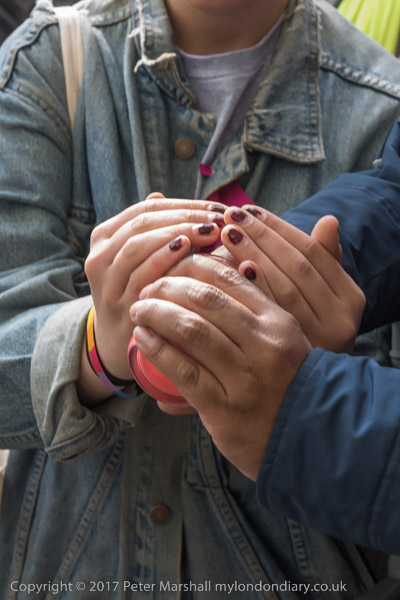 Poeple lit a candle; hands wrap around it to stop it being blown out
