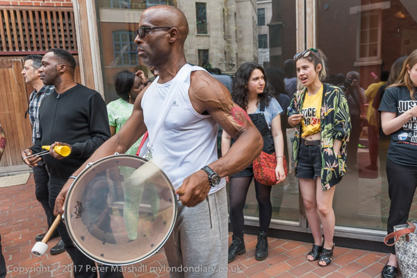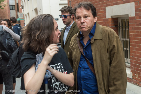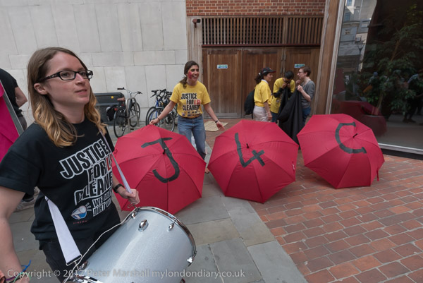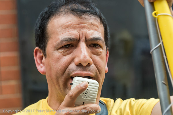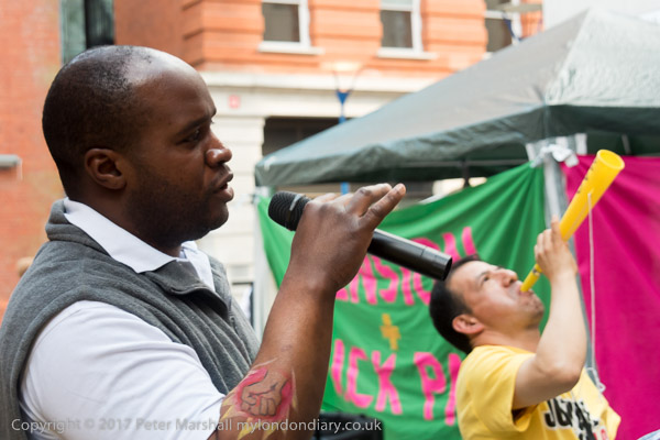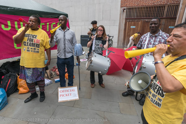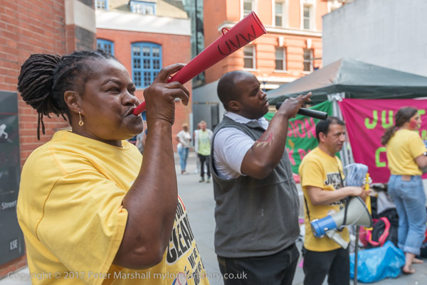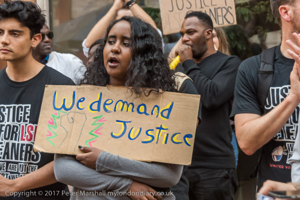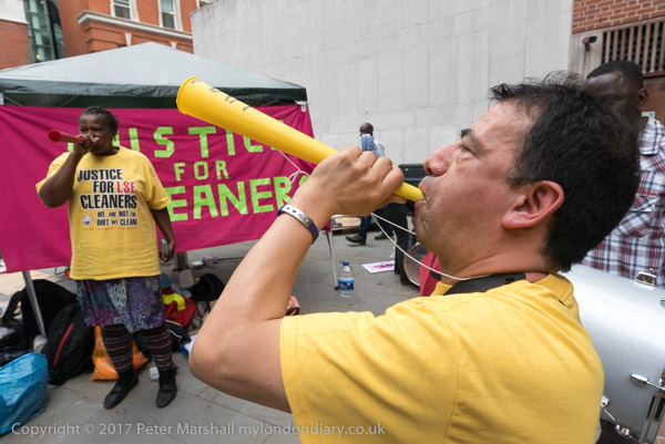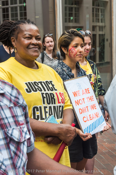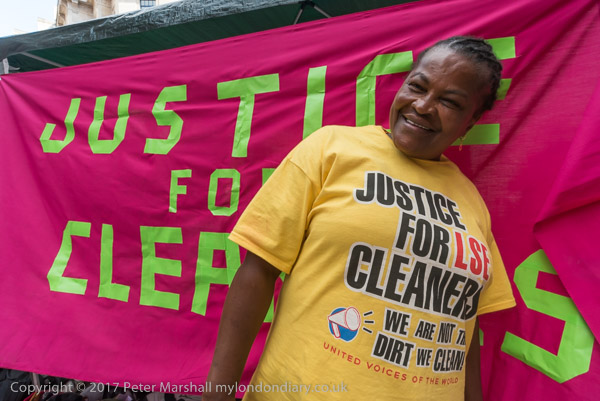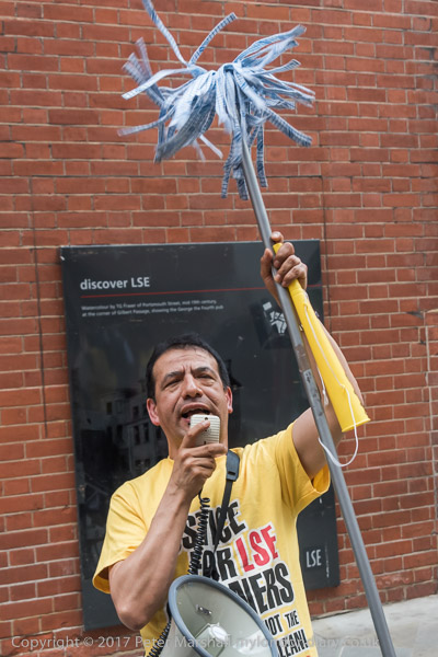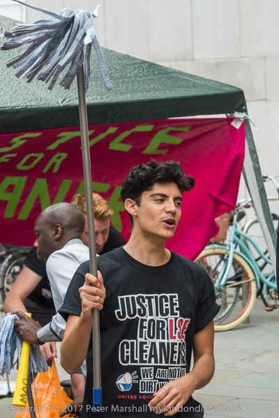 A man in a Justice for LSE Cleaners t-shirt holds a mop