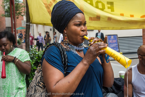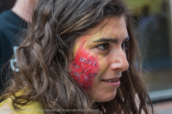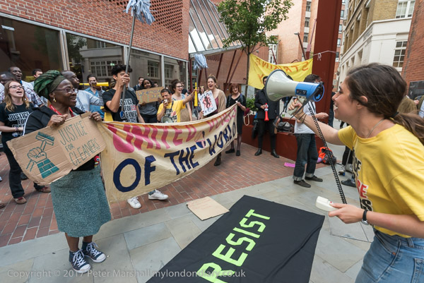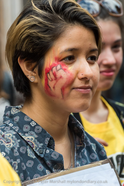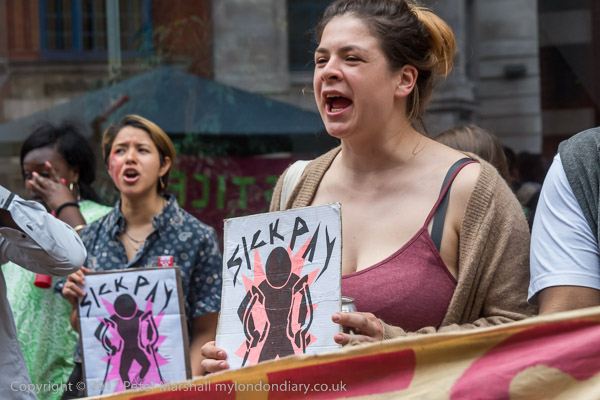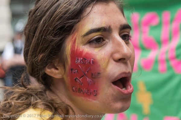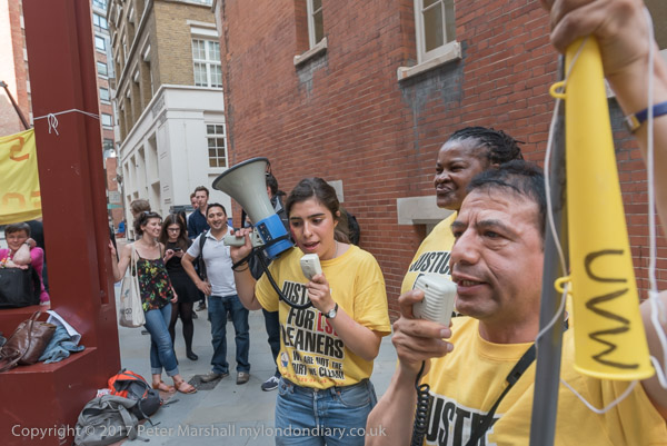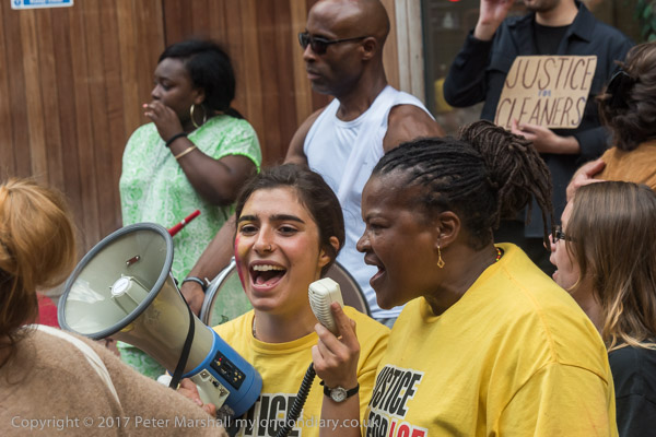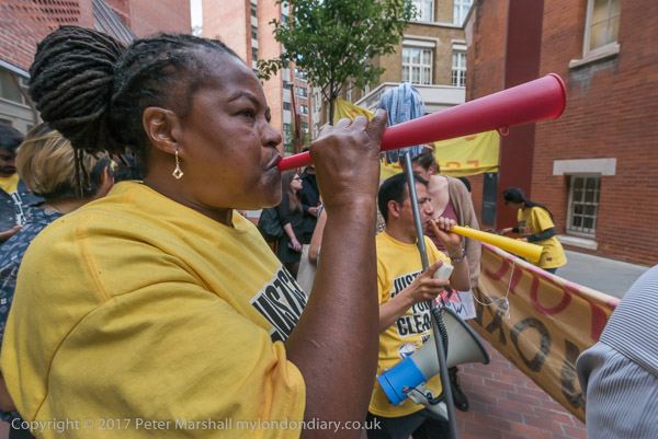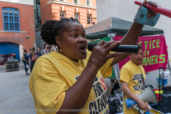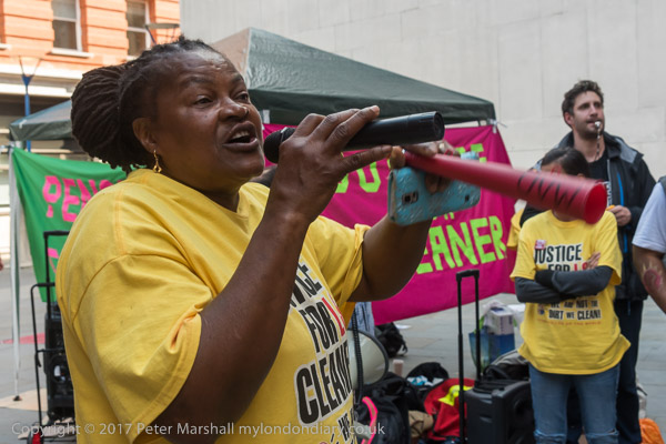 Mildred poses in front of the 'Justice For Cleaners' banner