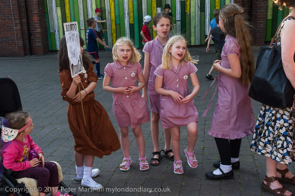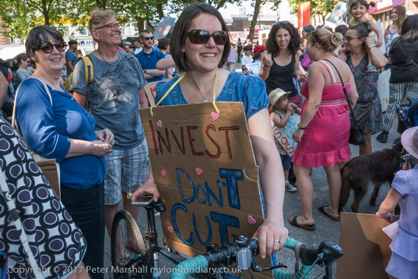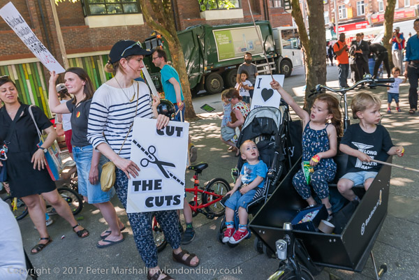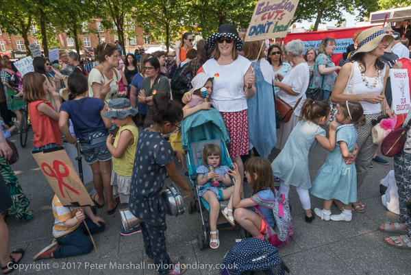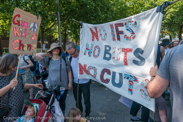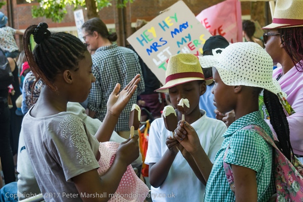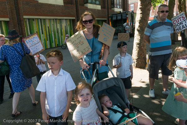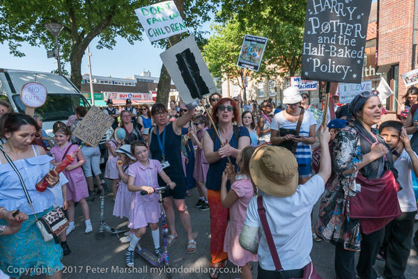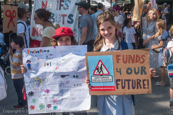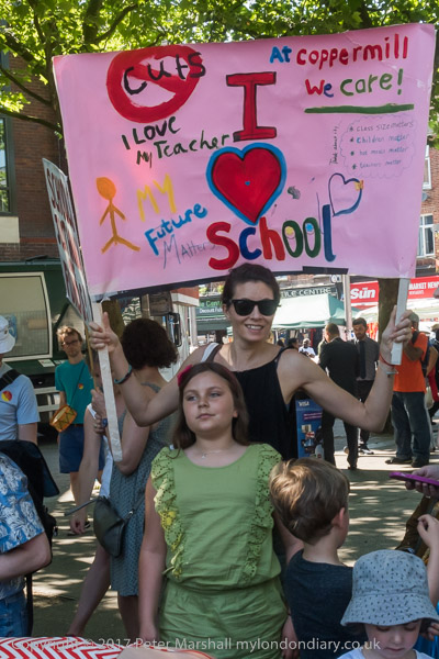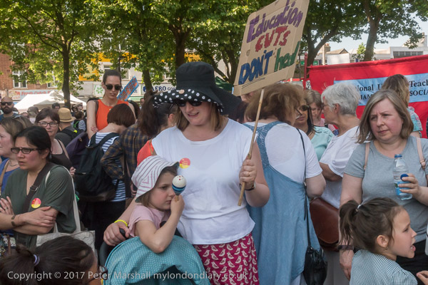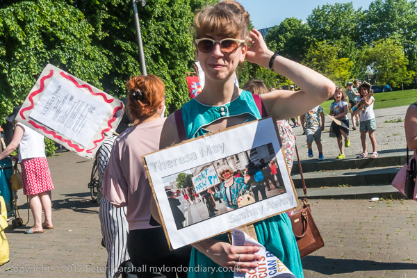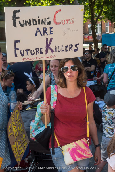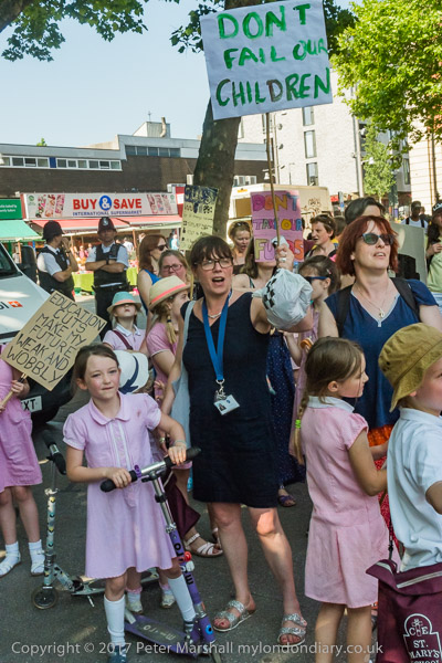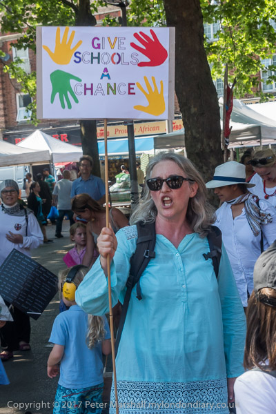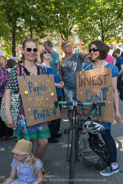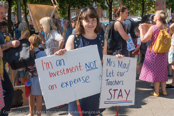 Parents and teachers came too. A poster reminds Mrs May that teaching