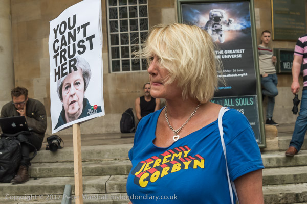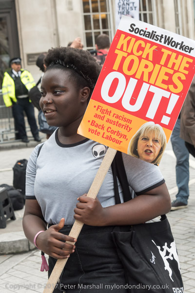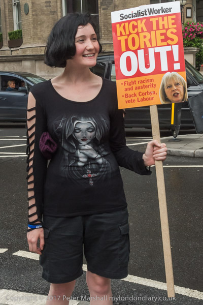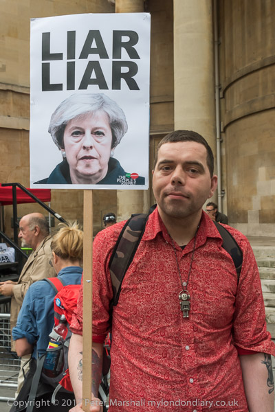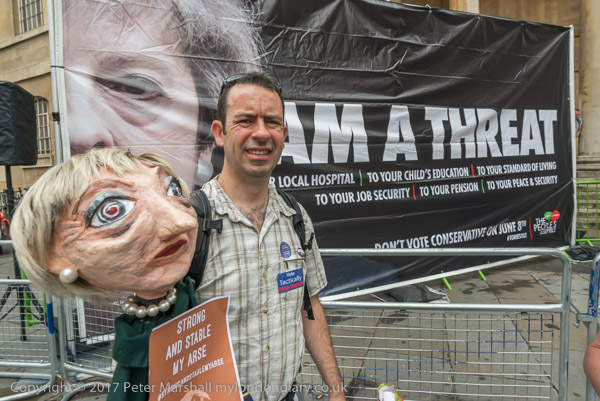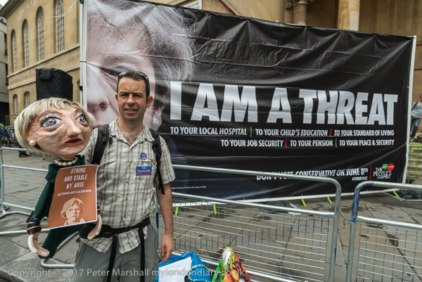 A ginat banner of a frame 'I am a threat' showing May - and a man