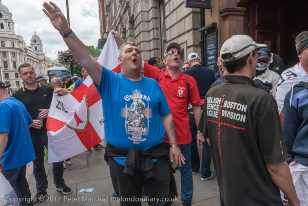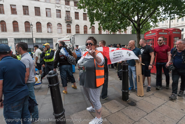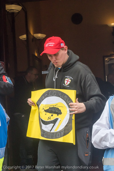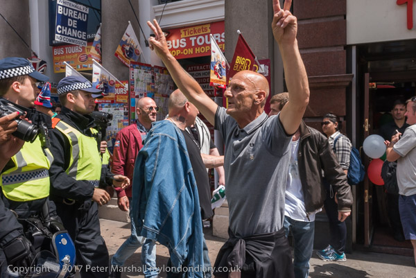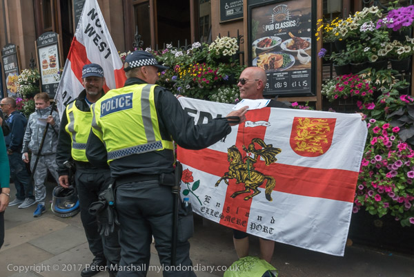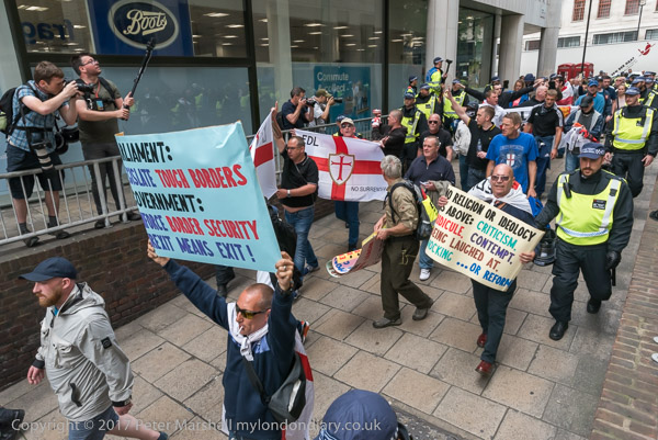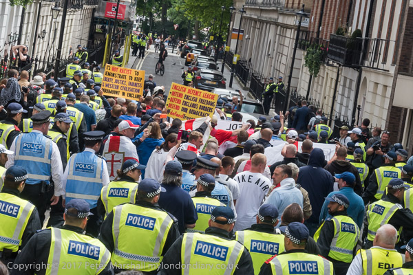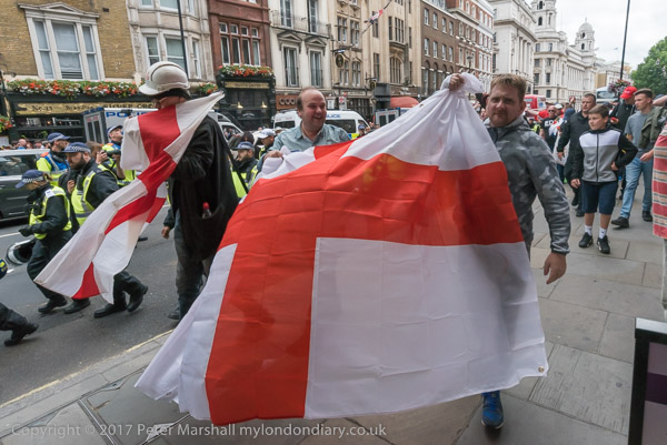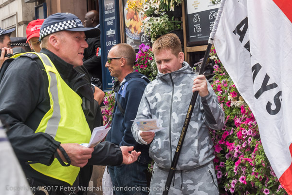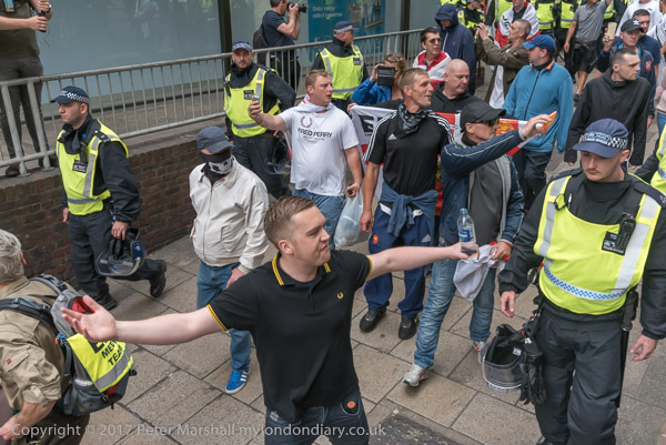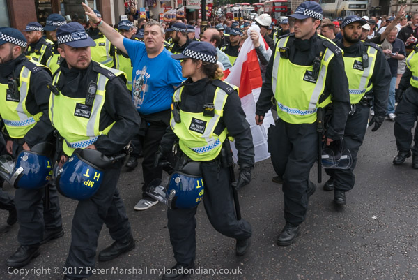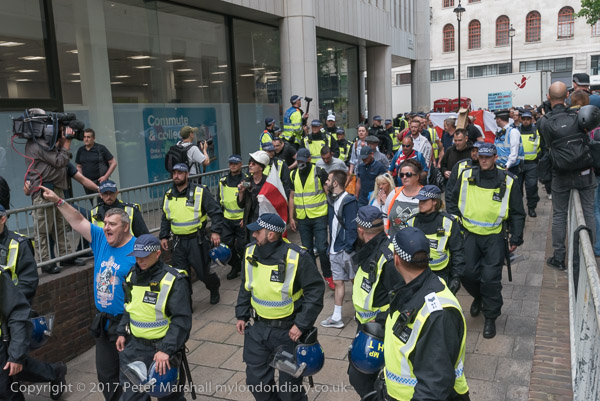 and police lead them down a side street towards the Embankment where