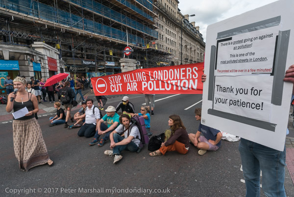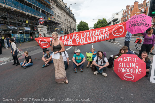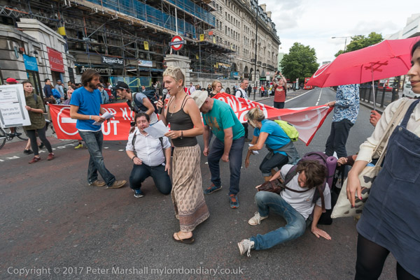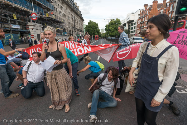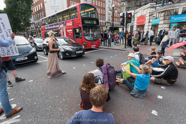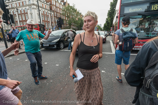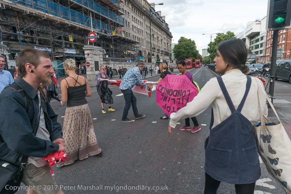 The protesters move out to occupy the road at the busy junciton with