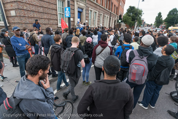 The crowd spread out into the street with a large group of mainly young