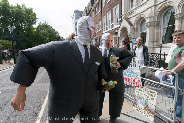 Two men in inflated suits and masks of Vedanta owner Anil Agarwal
