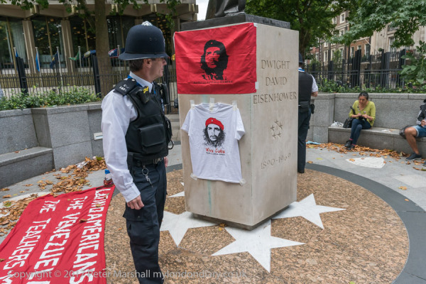 A police officer looks at Che t-shirts stuck on the plinth of the
