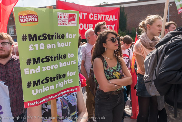 McDonald's workers who are holding the first UK strike against the company on Monday, US Labor Day, calling for an end to zero hours contracts, £10 an hour and union recognition get advance support outside the company's UK HQ.