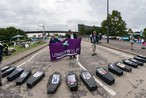 Protests continue outside the ExCeL centre where preparations are being made for the worlds's largest arms fair, DSEI, the Defence & Security Equipment International, backed by the UK government where arms companies and arms dealers sell weapons to countries around the world including many repressive regimes.
