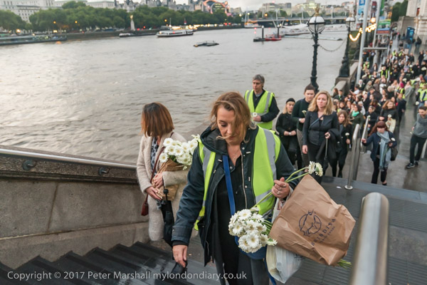 I met them at the end of their walk for for peace, justice, equality and dignity for all as they approached Westminster Bridge. They stood on the bridge and some threw flowers and petals into the River Thames.