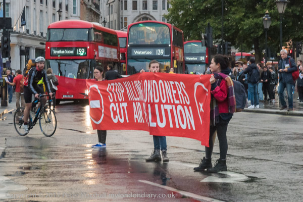 Campaigners from 'Stop Killing Londoners' cleared Trafalgar Square of traffic in a short protest against the illegal levels of air pollution in the capital which result in 9,500 premature deaths and much suffering from respiratory disease.