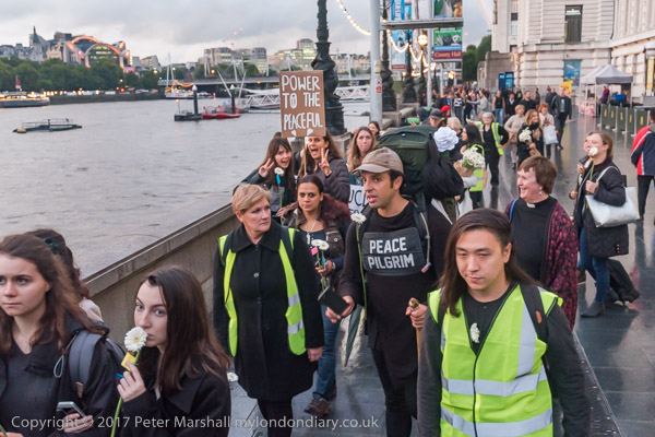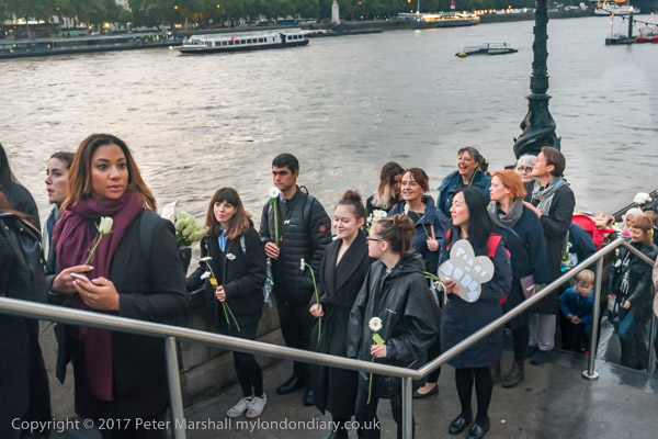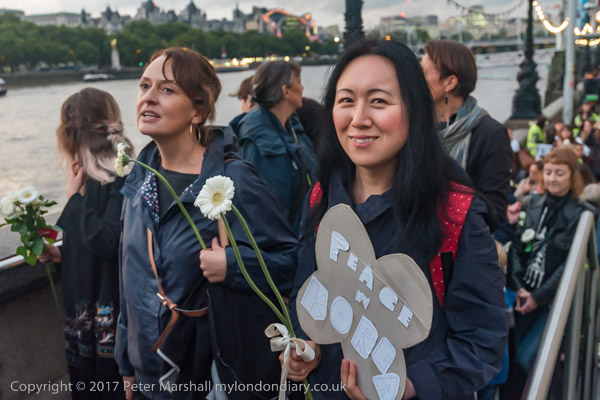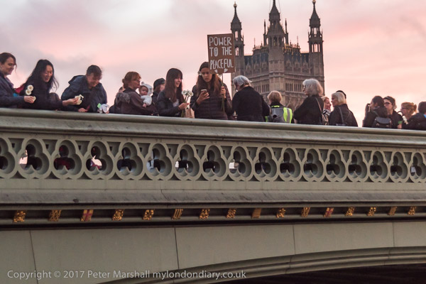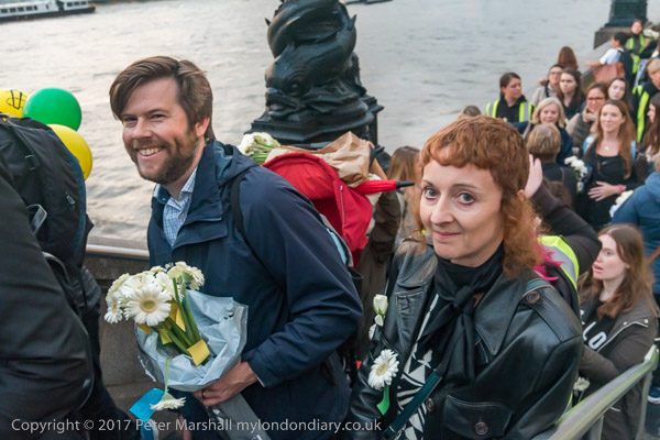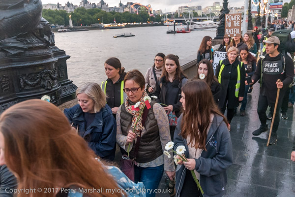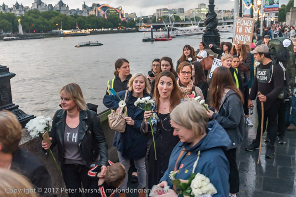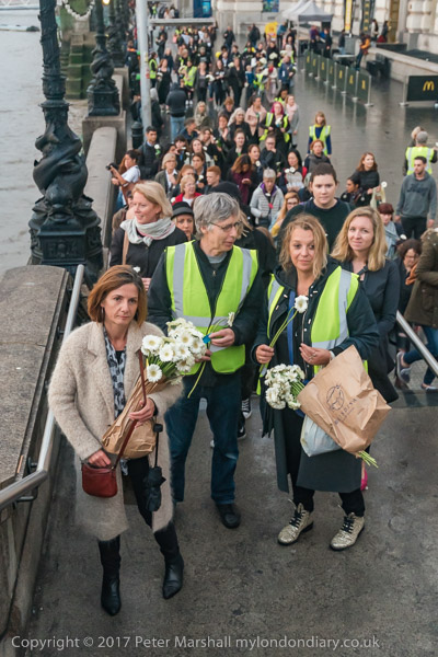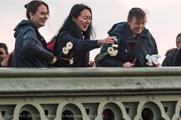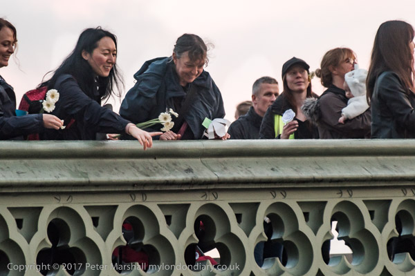 Marchers lined up along the bridge and some threw their flowers into