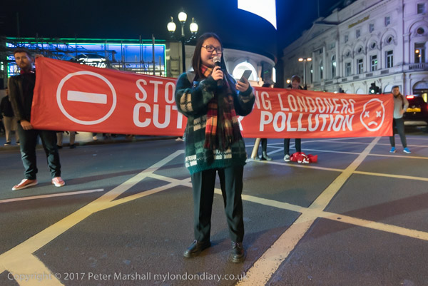 Campaigners blocked two of London's busiest junctions, Oxford Circus and Piccadilly Circus, for brief protests against the dangerous level of air pollution in London, explaining to motorists and pedestrians that NO2 and particulates from traffic fumes lead to thousands of premature deaths in London each year as well as much chronic suffering from lung diseases and breathing problems.