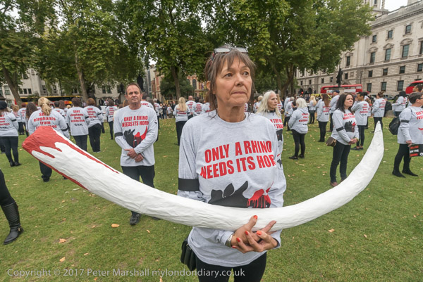 People stand in a diamond formation dressed in t-shirts against the ivory trade with some holding mock elephant tusks or rhino horns in a half hour long silent protest in Parliament Square as an event in the annual Global March for Elephants and Rhinos (GMFER) taking place around the world.