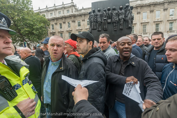 Although I was criticised by them for describing this as a counter-demonstration, it quite clearly was meant as such, although they were careful not to call the marchers racists. I went there before the march arrived and found a small counter-demonstration had assembled opposite Downing St to hold banners against racism and Islamophobia, and then returned to the Football Lads March, which by then was just approaching Trafalgar Square and came down Whitehall with them. Clearly the marchers felt they were being called racists by Stand Up to Racism and shouted abuse at them.