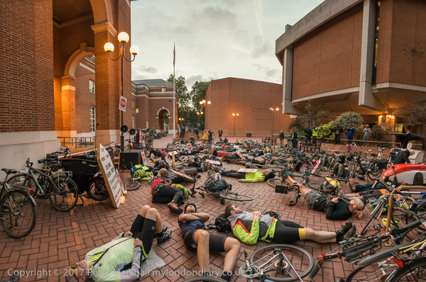 Die-In vigil and protest by Stop Killing Cyclists outside Kensington & Chelsea Town Hall after the killing by a HGV of a young 36 year old woman at Chelsea Bridge last week, the second cyclist killed by a HGV in the borough this year.
