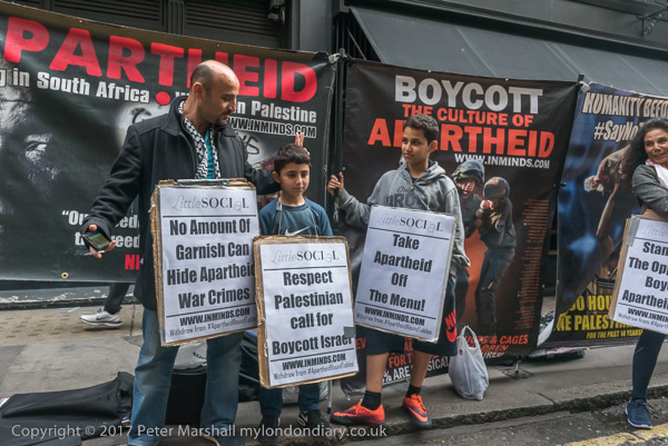 Human rights group Inminds protests outside Jason Atherton's Little Social Mayfair restaurant, calling on him and head chef Cary Dockerty not to break the Palestinian call for a cultural boycott of Israel by participating in Brand Israel culinary event 'Round Tables' in Tel Aviv in November 2017.