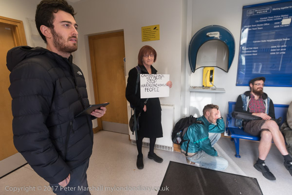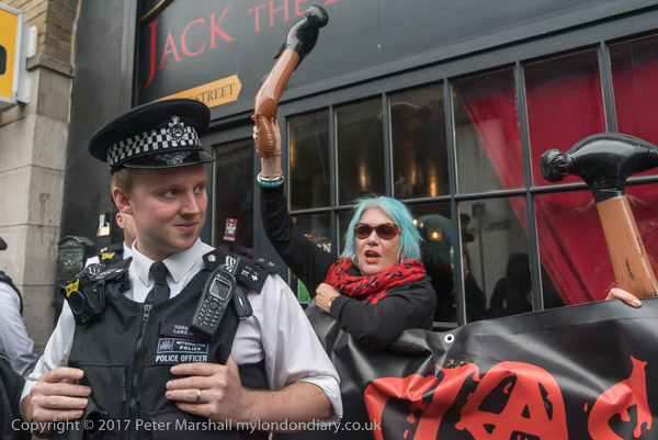 They complain that Tower Hamlets council has not enforced the planning decisions against the "museum" which was only given planning permission under the pretence it would celebrate the history of women in the East End and symbolically attacked the tourist shop and its illegal metal shutters and signage with plastic inflatable hammers. When police arrived they tried to get Class War to protest some distance from the shop without success.