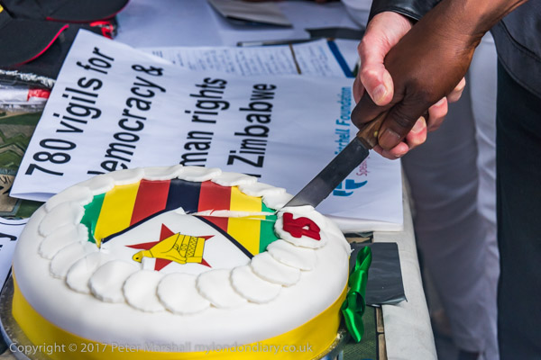 The Zimbabwe democracy and human rights vigil celebrated 15 years of weekly vigils - around 780 in total- outside the Zimbabwe Embassy on the Strand since October 2002 with a special rally and cakes.